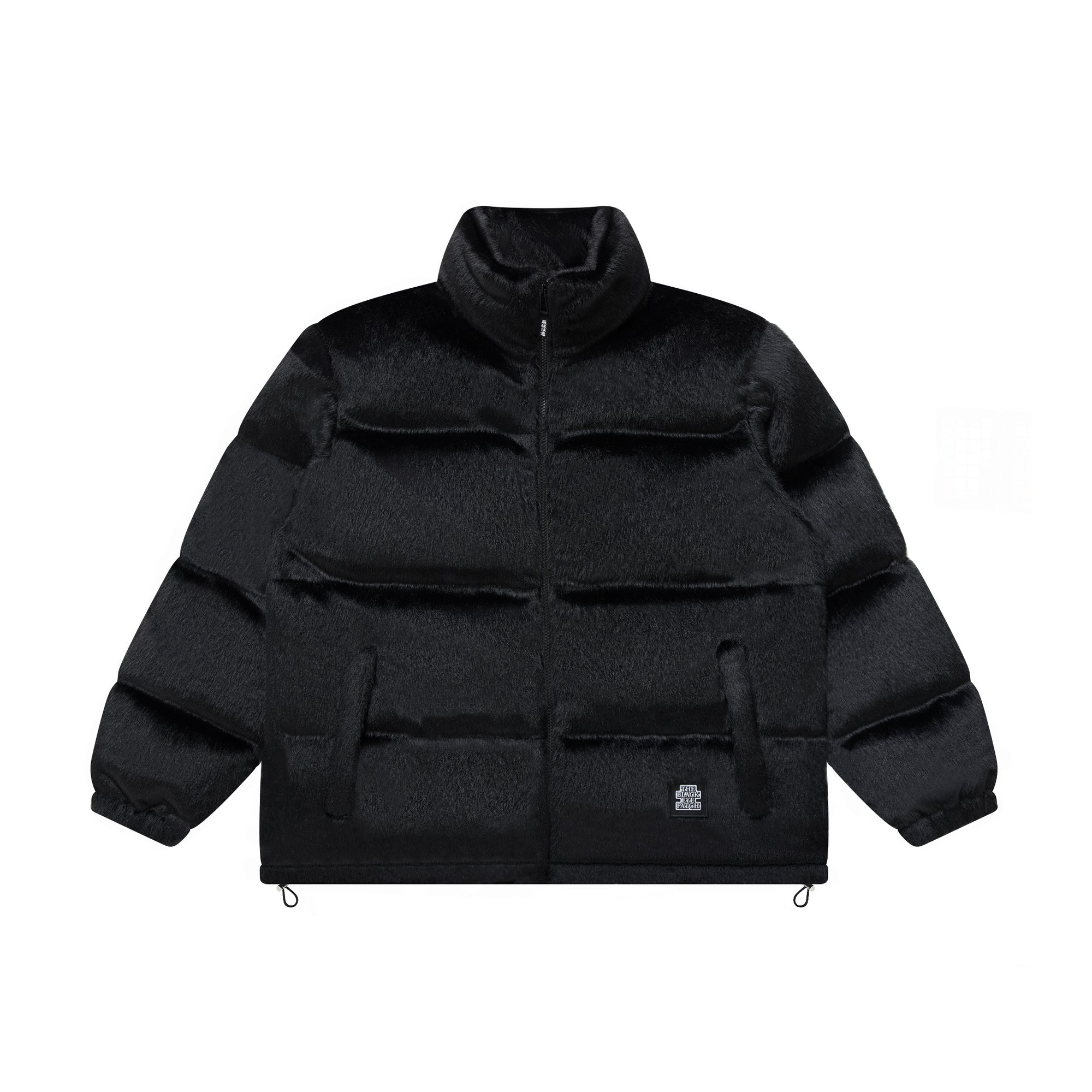 Down jacket featuring faux fur outer shell. Logo patch on the right pocket. Adjustable silhouette with drawstring hem.