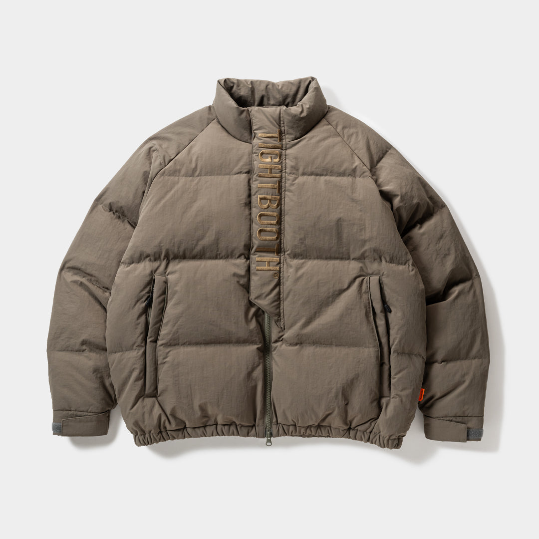 ラグランスリーブのスタンドカラーダウンジャケット。