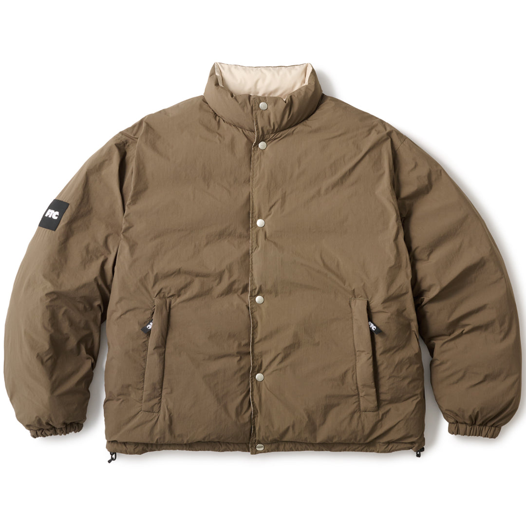 表地には防水加工を施したナイロンタフタを使用。右袖にブランドネーム。リバーシブル面にも防水加工を施したポリエステルリップストップタフタを使用。 左胸にブランドネーム。3M社のフェザーレスTHINSULATEの700フィルパワーの中綿入りリバーシブルジャケット。